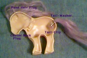 According to Liz (and Bonnie confirmed this), when they first made the original 6 Ponies(Cotton Candy, Minty, etc.) they noticed that they kept falling over on their faces because their heads were too heavy and the Ponies weren’t balanced. To solve this issue, someone in the office suggested putting a weight on the inside of the pony near the Pony’s back legs so it would stand upright without falling on its nose. The end solution was the tail washer, which was also incorporated into how the hair was installed to make it appear fuller (so the tail washer ended up pulling double duty of the first six ponies!)